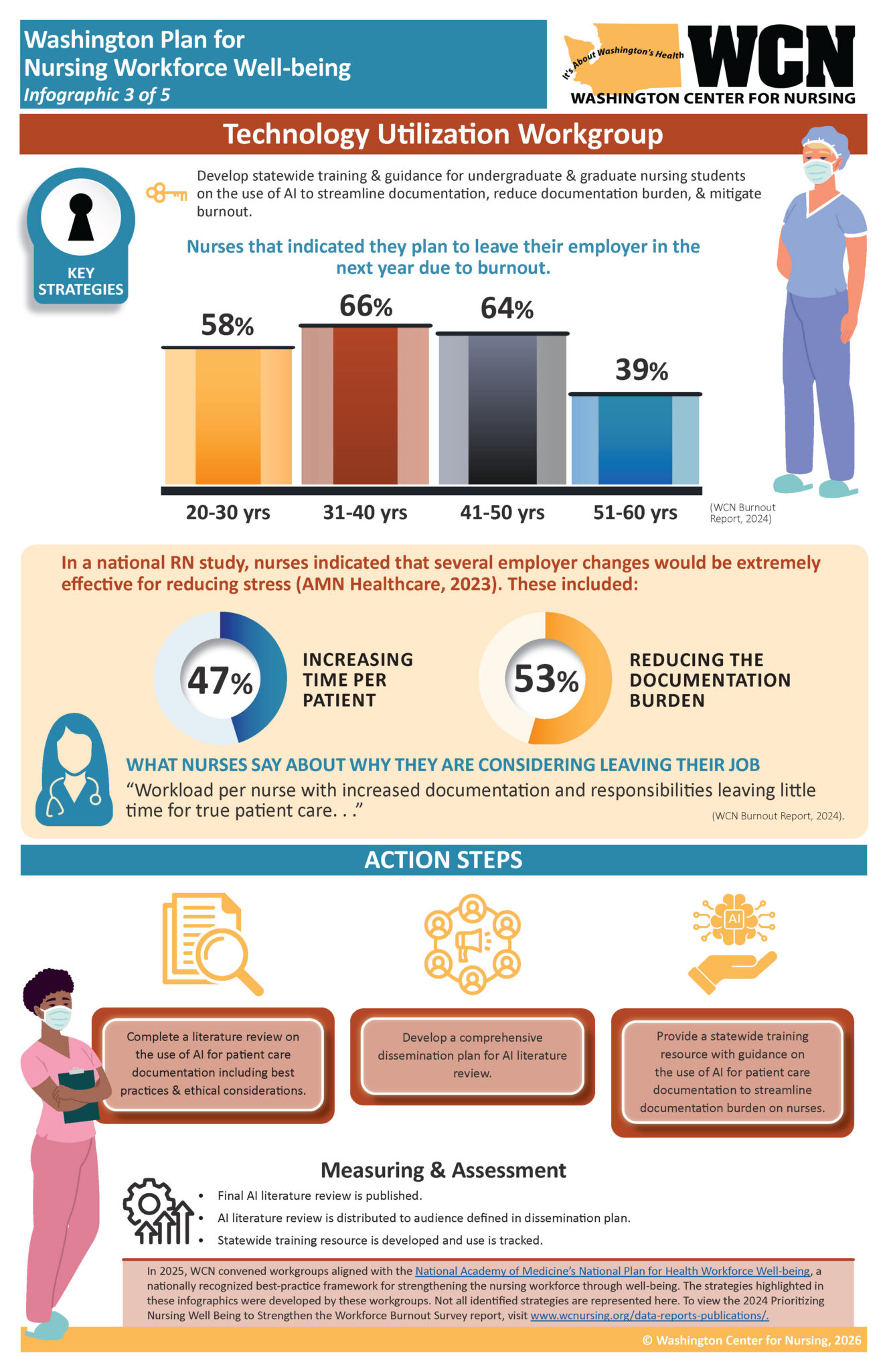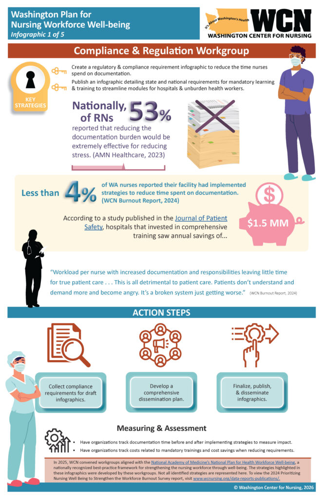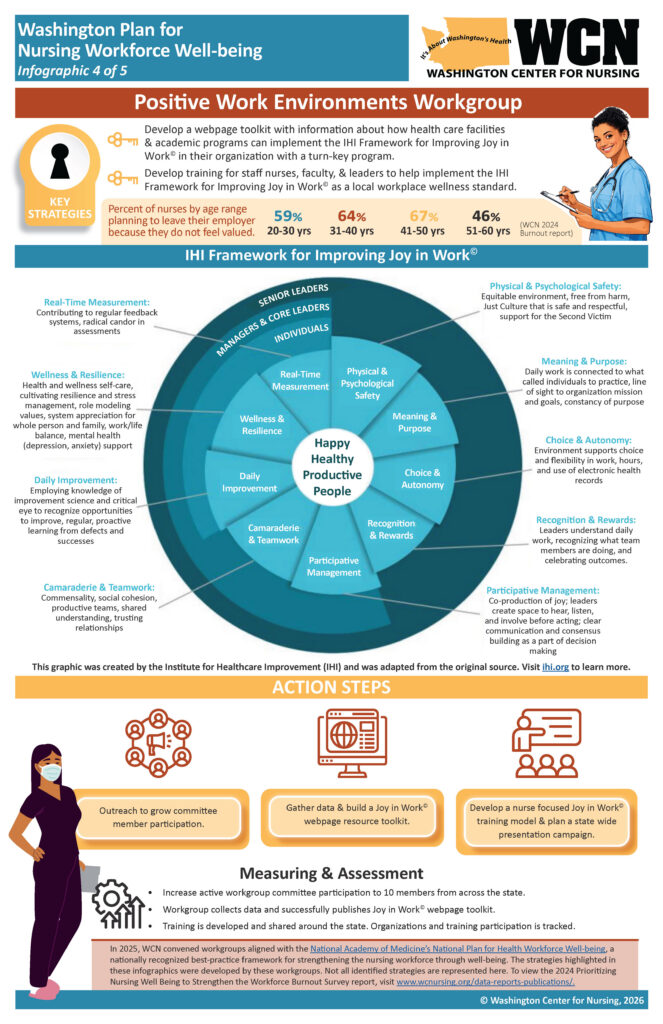 In 2024, the Washington Center for Nursing (WCN) published Prioritizing Nursing Well-Being to Strengthen the Workforce: Washington Burnout Survey and Next Steps. Essential to retention of the nursing workforce, workgroups were established to identify key strategies in 2025. This report summarizes action plans and key strategies for five workgroups. Two work groups, Compliance & Regulation and Technology Utilization, combined efforts to create one action plan. The Measurement & Assessment Workgroup collaborated to create evaluation approaches for the resulting four action plans.